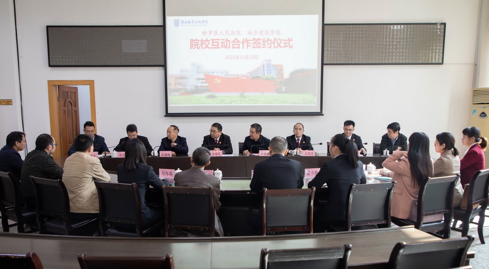 11月19日,新罗区人民法院与城乡建筑学院院校互动合作签约仪式在我校举行。闽西职业技术学院党委书记卢伟耀,龙岩市中级人民法院党组成员、副院长余福明出席签约仪式并讲话。