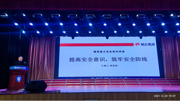 全国优秀施工企业恒亿集团工程中心总监欧劲羽高级工程师以《提高安全意识,筑牢安全防线》为题作建筑施工安全知识专题讲座。他围绕建筑行业的特点、相关法律法规、施工人员的权利和义务、安全生产中常用的术语、劳动防护用品的使用、施工现场作业安全须知、现场急救知识等七个方面,通过案例、数据等进行了详细的讲解。