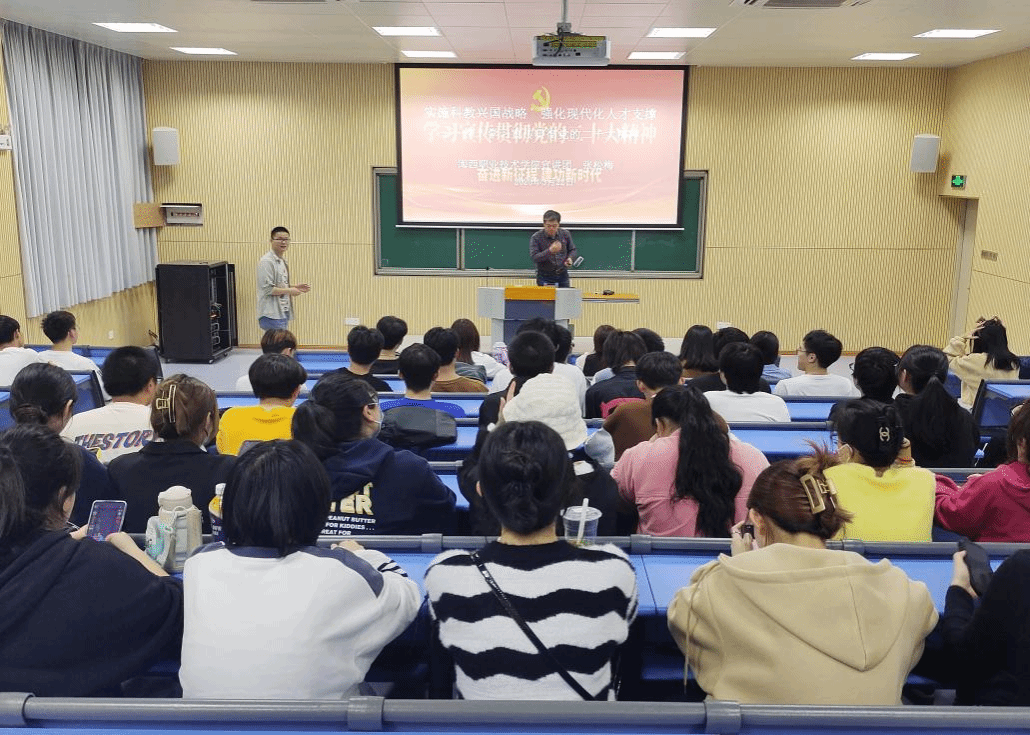 宣讲会上,张松梅老师以《实施科教兴国战略 强化现代化人才支撑》为题,从深入学习领会党的二十大的主题、深刻理解实施科教兴国战略强化现代化人才支撑的重大意义、努力成为卓越工程师大国工匠高技能人才等三个方面展开讲述。张老师的讲座主题鲜明、富有逻辑、联系实际,深入浅出,正能量满满,激发师生共鸣。