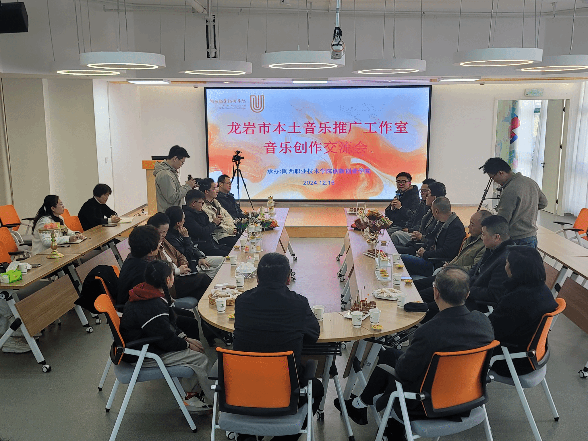 在随后举行的音乐创作交流会上,卢伟耀书记介绍了工作室成立的背景及目的,指出龙岩作为红色革命老区拥有丰富的历史文化资源和活跃的原创音乐氛围;而工作室作为福建省内为数不多的全景声原创音乐工作室之一,在音乐创作、技术应用及人才培养方面具有重要意义,并表示两个工作室将发挥公益性作用,助力龙岩文化旅游产业的融合发展。龙岩市人大秘书长张亮春指出,闽西职业技术学院原创音乐孵化室不仅是一个音乐创作和技术实验的空间,更是推动音乐创新与人才培养的重要基地,倡导要奋勇争先传承传统文化,增强龙岩本土音乐的文化自信,发挥工作室凝聚人才的优势,为更多原创音乐作者及本土音乐爱好者提供助力资源。以肖发灿、陈超超、邹晓强为代表的龙岩本土音乐的原创者们以音相遇、以合共赢,畅谈了创作心路历程,表示工作室不仅为创作者提供了前沿的技术平台,为本土音乐原创作者提供了展示才华的舞台、产生共鸣及合作交流的平台,也为原创音乐产业带来了无限可能。其他参与交流会的人员也对工作室提出了建立本土音乐作品库、促进本土音乐市场化推广和运营的建议和期待。