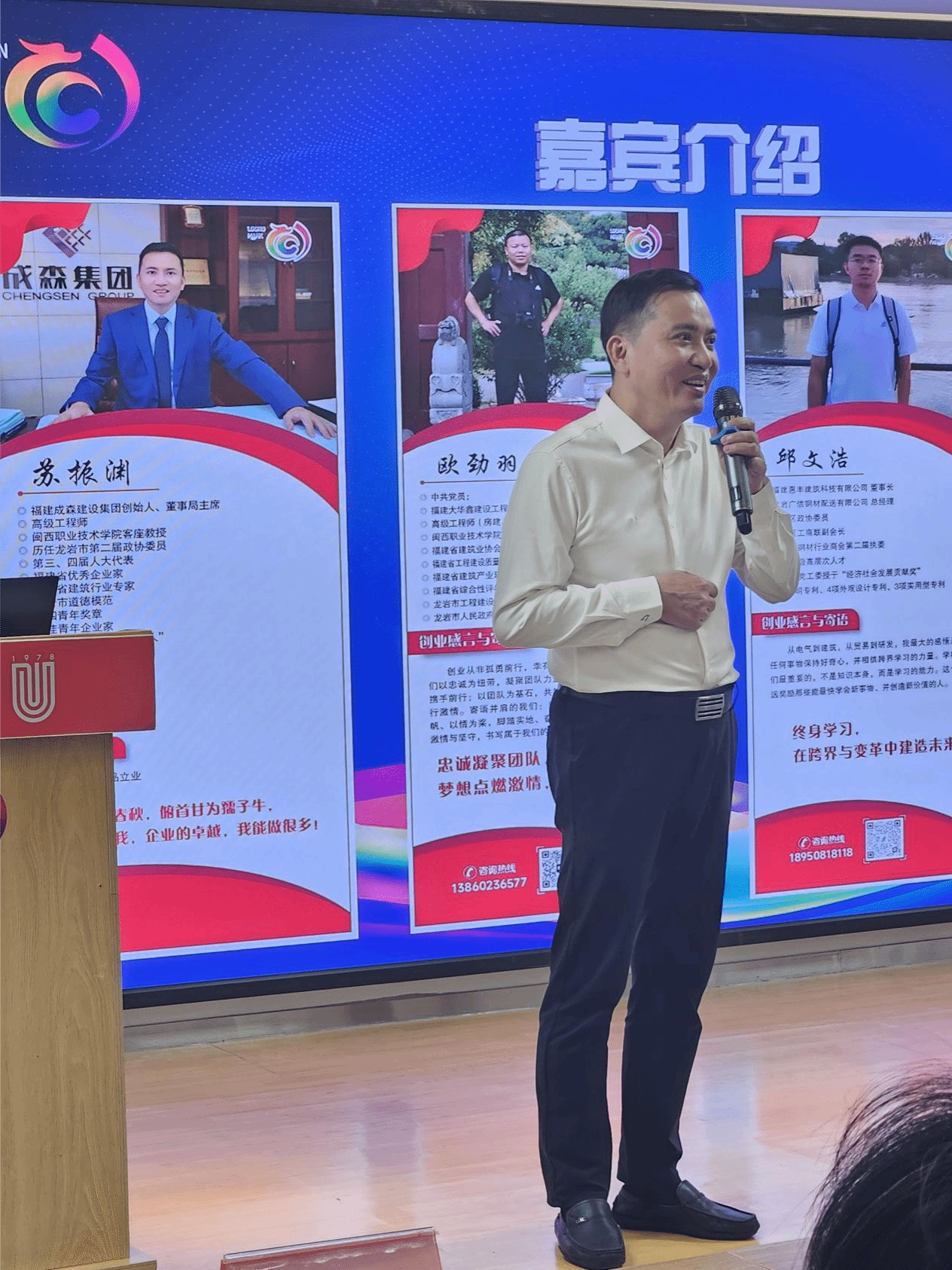 传承红色基因,打磨匠人之心 作为闽大校友,苏振渊以 “低着头进来、平着头读书、昂着头走向社会” 引发全场共鸣。他深耕建筑行业,以工匠精神为创业根基,强调专一、务实、精益求精;从苏区精神中汲取信念,鼓励学子修炼逆商,在逆境中坚持不放弃,用韧性筑牢人生高楼。
