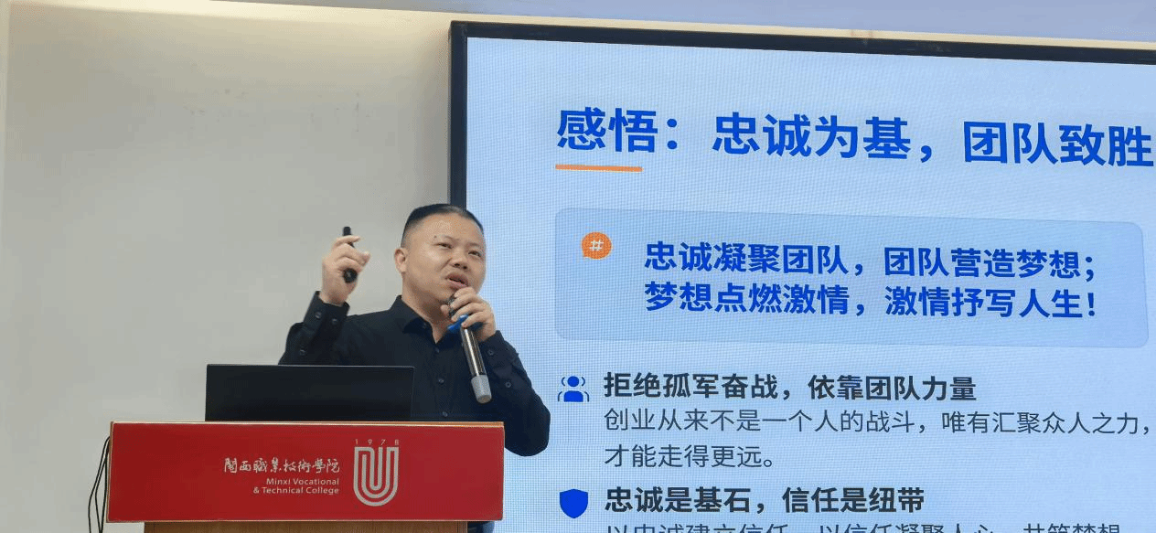 23级建筑工程技术专业学生、龙岩市汀江水食品有限公司法人赖俊良登台分享,讲述在校创业的实践经历与成长心得,为在场学子树立身边的创业标杆。