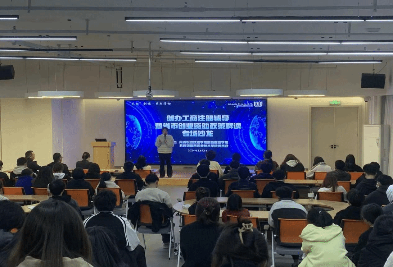 为引导和帮助大学生树立创新意识、锻炼创业能力,创新创业学院与共青团闽西职业技术学院委员会联合主办“龙标创坛”一月一主题系列活动。3月13日晚,在万源楼三楼龙标大学生双创孵化基地,开展了“创办企业工商注册辅导暨省市创业资助政策解读”专场讲座。福建省青创导师、知识产权师魏艳蓉,双创学院全体老师,入驻基地项目团队师生代表、校青年创业者服务站成员和来自各二级学院自愿报名的学生,共计120余名师生出席了活动现场。