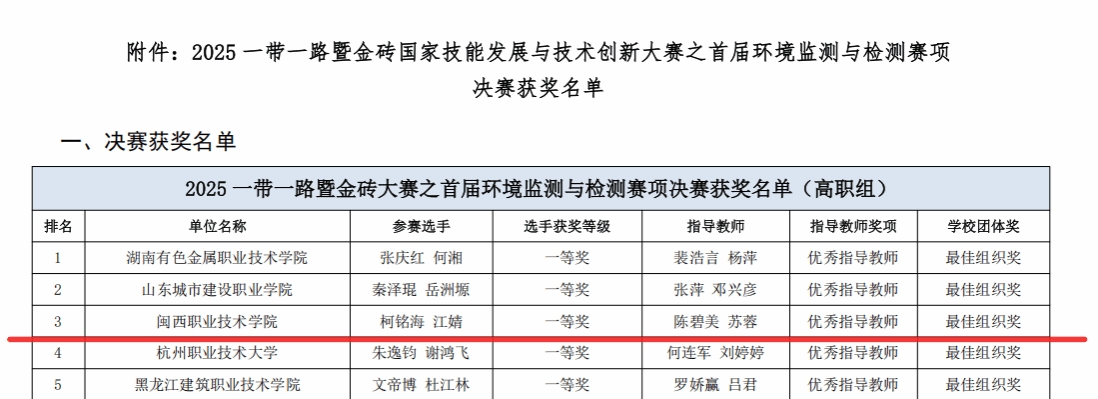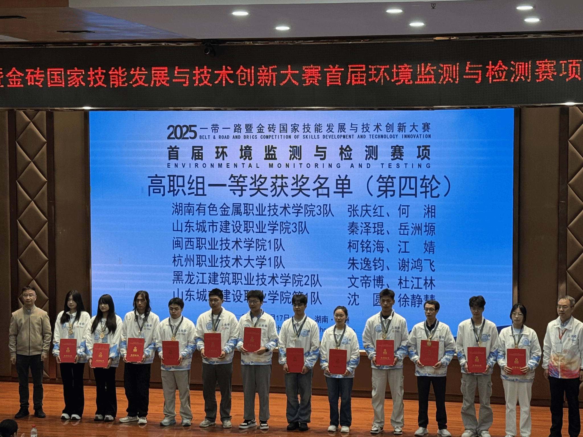 10月17日至19日,2025年“一带一路”暨金砖国家技能发展与技术创新大赛首届环境监测与检测赛项在湖南株洲举办。我校智能制造学院选派的柯铭海、江婧两位选手(指导老师陈碧美、苏蓉),以高职组总分第三名的成绩斩获一等奖,指导老师同时获评“优秀指导教师”,学校也荣获“最佳组织奖”。