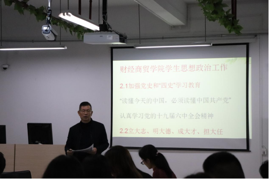 2021年12月8日,财经商贸学院党委副书记林照兴在实训楼八楼商务谈判室,向全体院学生两委干部上了一堂生动的思想政治课。