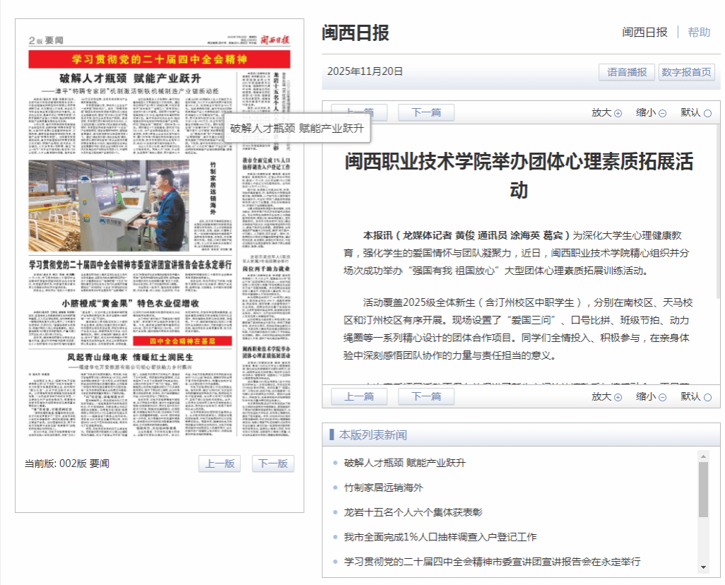 本报讯(龙媒体记者 黄俊 通讯员 涂海英 葛宾)为深化大学生心理健康教育,强化学生的爱国情怀与团队凝聚力,近日,闽西职业技术学院精心组织并分场次成功举办“强国有我 祖国放心”大型团体心理素质拓展训练活动。