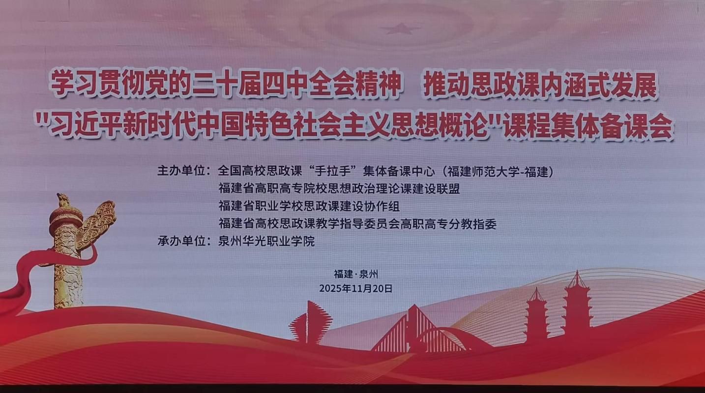 为深入学习贯彻党的二十届四中全会精神,全面落实习近平总书记关于“守正创新推动思政课建设内涵式发展”的重要指示,坚持不懈用习近平新时代中国特色社会主义思想铸魂育人,紧扣职业教育类型定位,推动思政教育与技术培养深度融合,切实筑牢教育强国建设的职教根基,进一步提高思政课的针对性、吸引力与实效性,不断提升思政课教师教学能力与育人水平,福建省高职高专思政课联盟于2025年11月19日至21日在泉州华光职业学院举办“福建省高职高专院校思政课建设联盟2025年会暨福建省职业学校思政课建设协作会议”,我校马克思主义学院负责人参会。