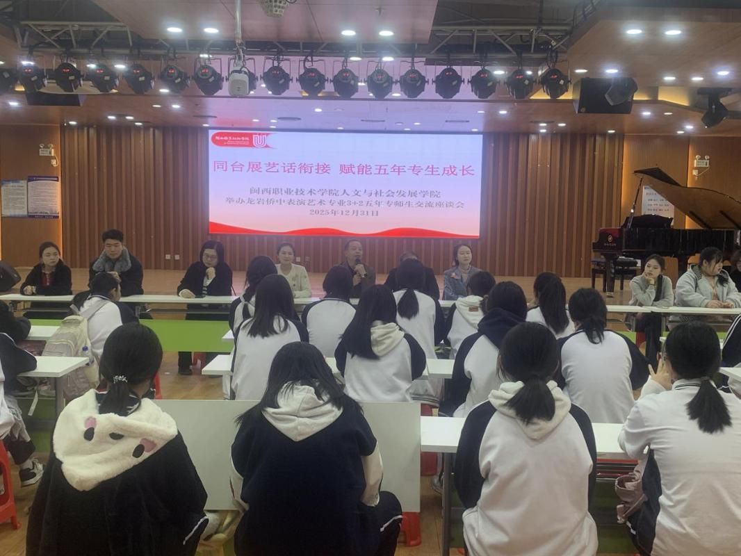12月31日下午,人文与社会发展学院与龙岩侨中举办表演艺术专业3+2五年专师生交流座谈会。龙岩侨中师生一行应邀到访人文与社会发展学院,以艺会友、共话衔接,扎实推进中高职协同育人工作走深走实。活动现场,学院院长李文春、党委书记刘加养先后讲话,深刻阐释3+2合作办学模式的育人价值,向在场学子寄予勤学笃行、顺利完成学段过渡的殷切期望。