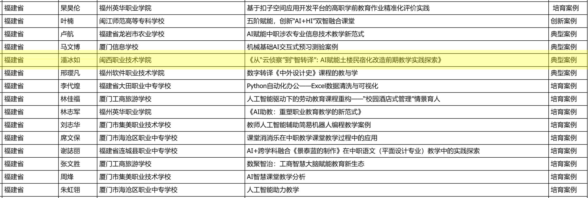 据悉,本次案例征集活动共收到全国各级各类教师案例4609件,其中职业教育教师案例324件。经省级推荐、国家级评审,最终评出职业教育类创新案例16件、典型案例67件、培育案例241件。其中福建省入选的职业教育案例共计15件。