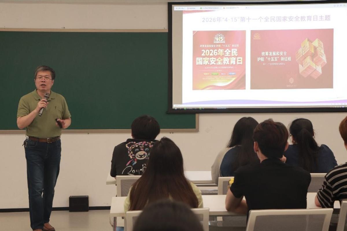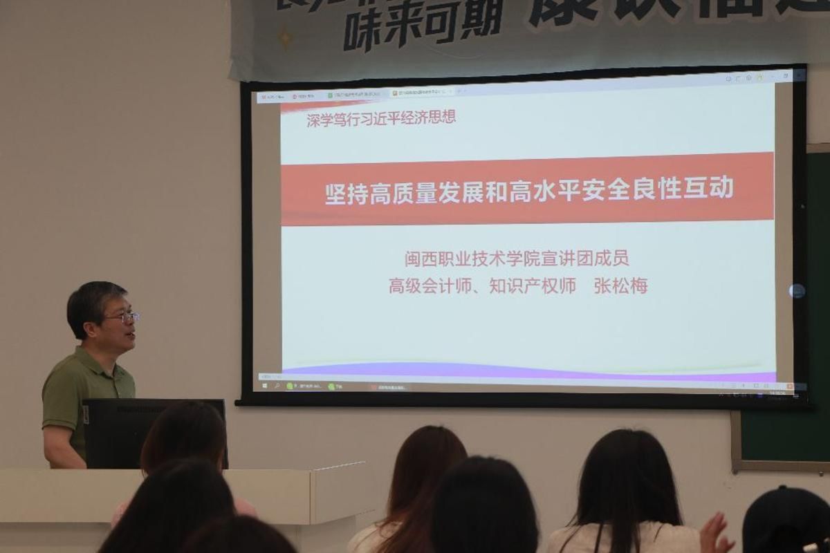 为深入推动习近平经济思想进教材进课堂进头脑,认真落实《全面推进"大思政课"建设的工作方案》,在2026年“4·15”第十一个全民国家安全教育日前夕的4月14日,校宣讲团成员、校离退休党总支第一支部党员、高级会计师、知识产权师张松梅老师在万源楼409和实训室E为财经商贸学院学子开设学习宣传习近平经济思想专题系列讲座。财经商贸学院团委负责人、入党积极分子、青马班学员、2024级和2025级团员学生代表参加系列宣讲活动。宣讲活动由校宣传部(统战部)联合财经商贸学院党委、马克思主义学院共同主办,校离退休党总支联合承办。