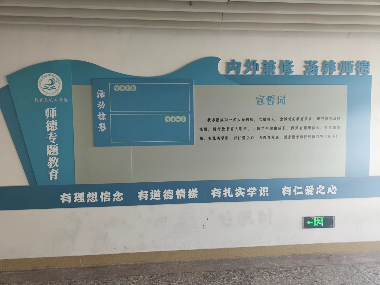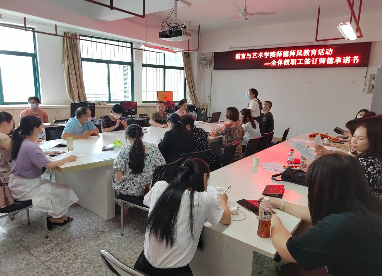 为深入学习贯彻习近平总书记关于师德师风的重要论述,引导全体教职工“立师德、铸师魂、传师风”,争做新时代“四有”好老师,推进“师德师风建设年”工作稳步开展,落实《新时代教师职业行为十项准则》,践行新时代师德规范, 教育与艺术学院驰而不息,积极开展师德师风教育工作。利用暑期,教育与艺术学院在岩声楼6楼做师德师风宣传专栏。7月21日,在大匠堂开展学前教育和早期教育专业2020级学生实习动员暨安全教育会上,教育与艺术学院党委书记李瑛进行了师德践行能力教育。8月 27 日上午,学院在岩声楼810 会议室召开全院教职工大会,安排了开学第一课,并组织全体教职员工现场签订师德承诺书,加强全体教师的师德师风教育和监督,促进新学期教师队伍师德师风建设工作水平不断提升。