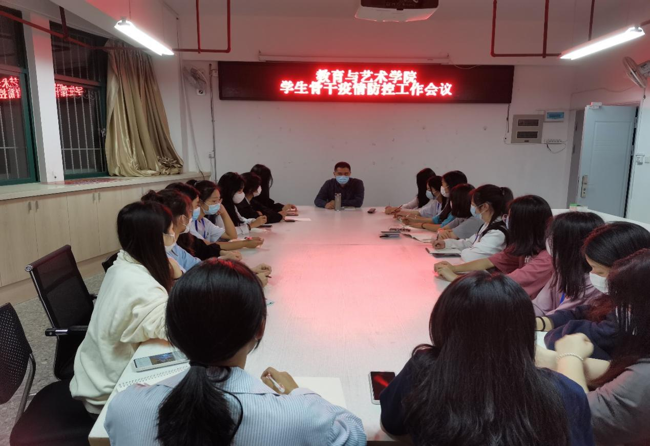 2022年3月20日,教育与艺术学院在教学综合大楼810会议室召开学生骨干疫情防控工作会议,出席此次会议的有学院领导和学生骨干。