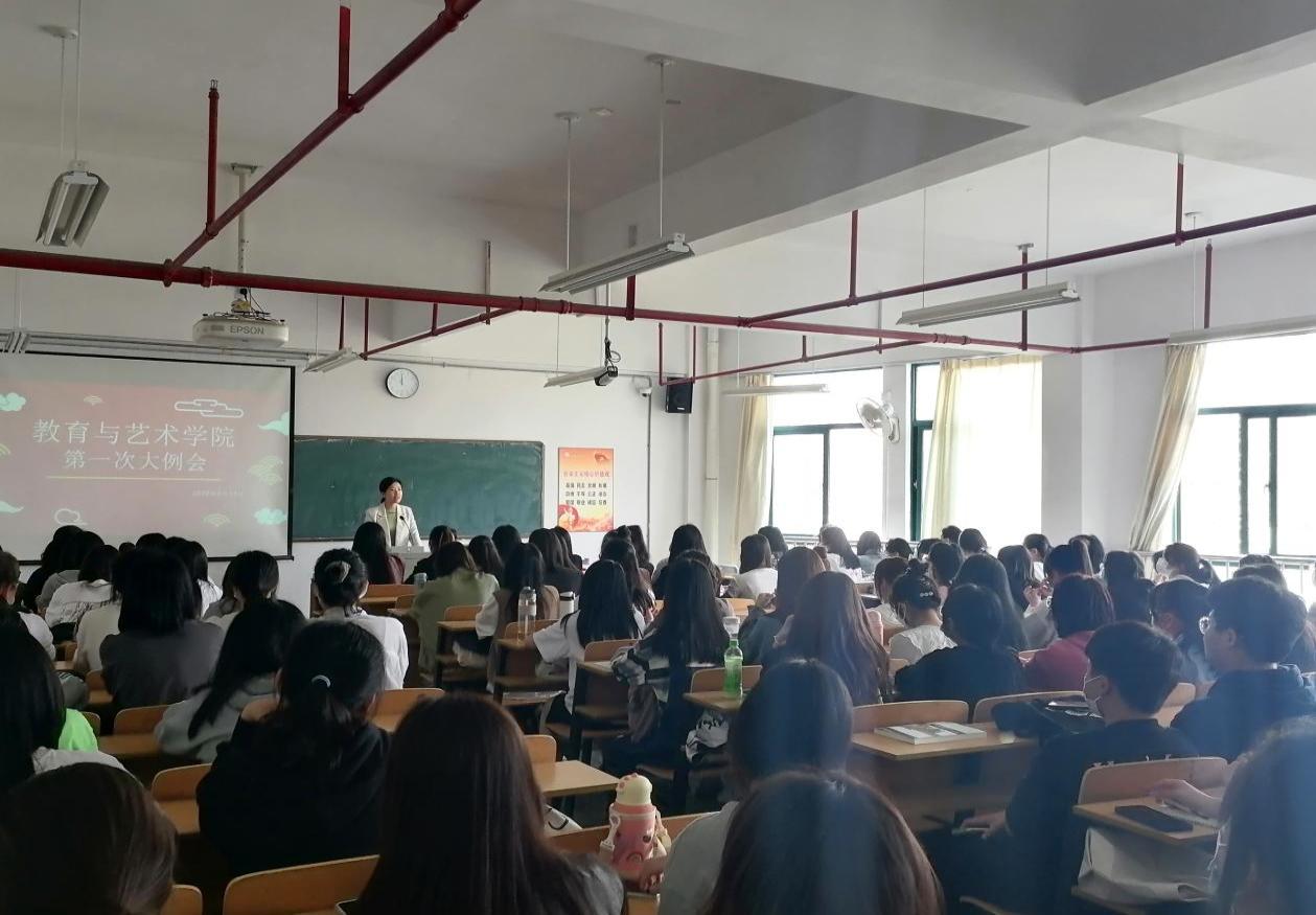 教育与艺术学院于2022年3月14日在教学综合大楼711教室召开院两委2021-2022学年第一学期的第一次大例会。出席本次会议的人员有团委书记钱雪梅老师、团委副书记黄惠萍、学生会主席叶咏瑜、学生会副主席陈嘉怡、各年级团总支、各部门负责人及干事。