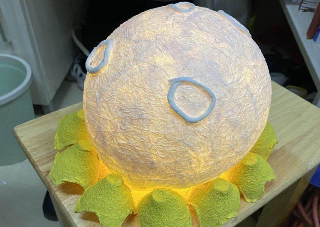 在活动期间,同学们围绕“废物利用、环保创新”主题,以“绿色、创新、快乐、睿智、团结”展开丰富的想象,利用废旧物进行精心设计、精心制作, 让其发挥全新的功能,达到宣传节能环保的目的。在评比中,工作人员发现同学们将废旧的快递纸箱和塑料瓶做成可爱生动的“充电”机器人;将纸张变成美丽的月球灯罩,一串小小的暖光灯泡为月球提供了光源,废旧的鸡蛋盛放盒变成底座,一个温暖的月球小夜灯照亮漆黑的夜。更令人想不到的是废弃口罩可以变成发圈和花朵。展现同学们无穷的想象力和创造力。