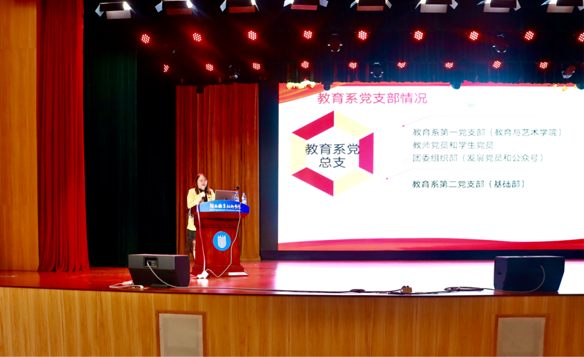 会议由学院党总支副书记曹熠城老师主持,党总支书记连玲娜老师、院长李文春老师和第一支部书记黄翠宝老师分别作专题教育报告。连玲娜书记从新学期新起点出发,要求新生要学会独立思考、生活、学习和工作,要进行大学三年规划;李文春院长介绍了教育与艺术学院及各专业的概况,启发新生思考“我来这做什么”,“我的大学怎么过”;黄翠宝老师向新生介绍第一党支部的情况和入党的要求、流程;最后,曹熠城副书记强调了新生要注意人身和财产安全,遵守学校纪律。