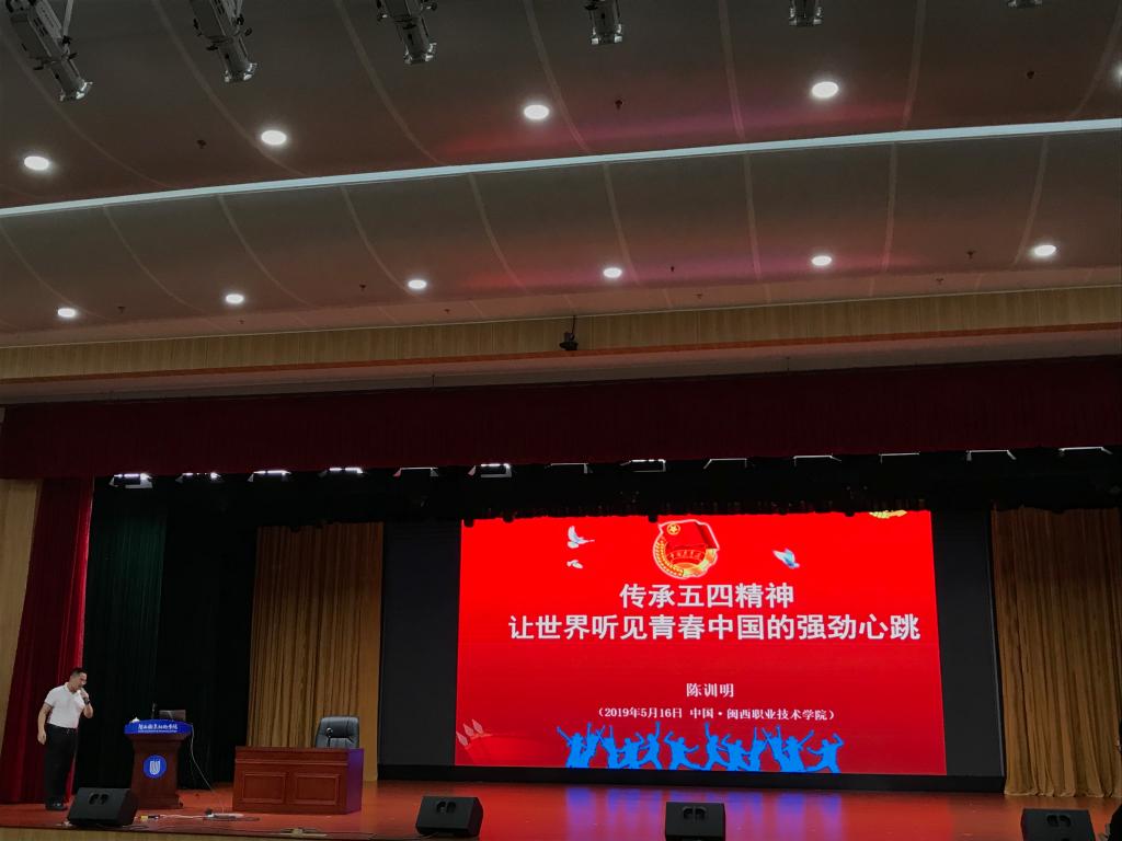 陈训明副书记作了主题为《传承五四精神 让世界听见青春中国的强劲心跳》的宣讲,从新时代青年的使命与责任、向总书记学习是最好的学习以及向内在寻找成长的力量三个方面展开讲解,着重阐述了“要坚持大历史观,把五四运动放到中华民族5000多年文明史、中国人民近代以来170多年斗争史、中国共产党90多年奋斗史中来认识和把握”的原因,强调了青年学生传承好五四精神必须做到爱国、进步、民主及科学这四点要求,其中针对怎么向习近平总书记学习提出三点要求:一、欲想成功先练累功,二、理想的起点决定生命的终点,三、一生勇作行动派。最后,陈训明副书记还送给大家五项“功夫”分别是:思功、累功、做功、大功、谦功,勉励青年学子要向习近平总书记学习,坚定理想,勤于学习,向美而行,止于至善,勇于筑梦、追梦、圆梦。
