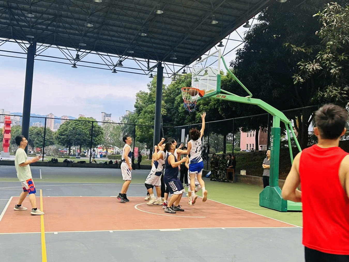 随着裁判一声哨响,比赛拉开了帷幕。老师队伍和学生队伍迅速展开激烈追逐,赛场上队伍互不相让,队员们激烈交锋。每一位参赛的师生都精神饱满,斗志昂扬,他们娴熟的技术和默契的配合演绎出一个又一个精彩瞬间。场外的同学们为他们呐喊助威,整齐的口号声伴随着每一次的进攻和得分此起彼伏。在比赛逐渐进入了白热化阶段,赛场上的每个人丝毫不放过每一次进球的机会,伴随着他们矫健的步伐和坚定的目光,篮球在高空中抛出一条条完美的进球弧线。四节精彩的比拼展现出了运动员们之间的默契配合和团队协作能力。比赛结束后,教师运动员们与学生运动员们相互握手,表示尊重。最后,以师生运动员们合影留念落下了帷幕。