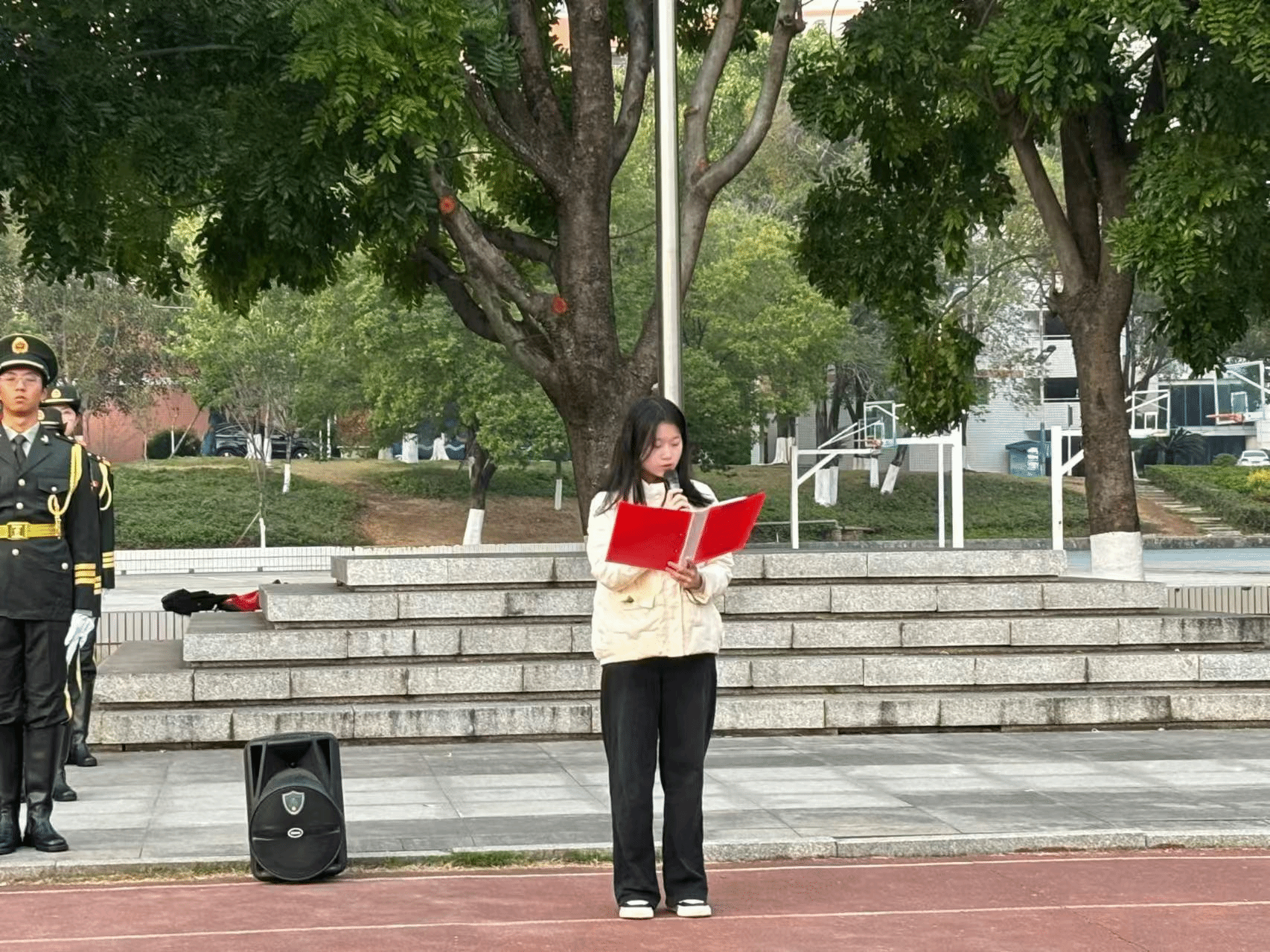 仪式一开始,国旗护卫队队员们着装整齐,身姿笔挺如松,目光坚毅似炬。他们迈着整齐划一的步伐自操场一侧走来,护送那承载着无数荣耀与敬意的国旗走向升旗台。当激昂雄壮的《义勇军进行曲》奏响,升旗手身姿矫健、动作娴熟,振臂一挥,国旗如灵动的赤练,向着高空律喷薄而出,化作嘹亮歌声,响彻校园上空。随后,学生代表郑思艳开展“纪念国家宪法日”为主题的国旗下发言,告诉同学们该如何了解自己的权利和义务,明白什么可为,什么不可为。呼吁大家从自身做起,从身边小事做起,弘扬宪法精神,共筑法治社会。在升旗仪式最后,全体同学在领誓人的带领下庄严宣誓,“忠于中华人民共和国宪法,维护宪法权威……”,洪亮誓词回荡校园,彰显大学生尊崇宪法、践行法治的决心,为这场升旗仪式画上浓墨重彩句号。