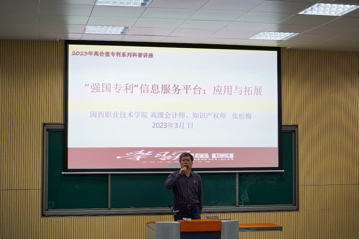创新是发展的本质,知识产权是创新的成果,解密知识产权的创造、保护、管理和运用,离不开知识产权信息检索与利用。为更好地普及高价值专利相关知识,软件工程学院开展了《“强国专利”信息服务平台:应用与拓展》高价值专利科普讲座,特邀闽西职业技术学院高级会计师、知识产权师张松梅老师主讲。