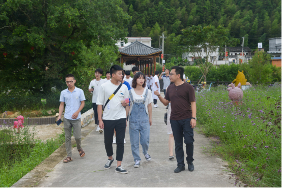 8日下午,师生们来到了武平县中堡镇,对“亲水互助,水云花谷”乡村振兴示范点 ——互助村进行实地调研。初入互助村,一幅宁静、和谐、优美的乡村花卷映入眼帘,深深吸引着我们。青山环抱,绿荫葱葱,流水潺潺,每走一处都是惊喜,每望一幕都是景色,有种置身画境,超凡脱俗的感觉。据该村负责人介绍,亲水互助是以“一河两岸三园四景五种六养”的发展模式,按照乡村旅游3A级标准进行规划设计,目前已完成一期工程建设,成效初显;同时,在一河两岸种植碧桃,连片规划种植百香果、台湾圣女果、甘蔗园、脐橙等种植产业,引导农户发展象洞鸡、泥鳅等特色养殖,目前该村象洞鸡养殖大户达12户,形成以“一鸡一果”为主导,其他产业蓬勃发展的增收路子。师生们感受到农村的巨大变化,连连惊叹,就如何促进乡村振兴,提升群众获得感、幸福感,与该村干部、群众展开了热烈的讨论。