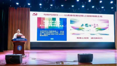 刘永政主任以《与时代同行,让青春在新征程上绽放绚丽之花》为题,以手语操开场,通过典型案例分析,生动展现了中国共产党人坚定信念,践行宗旨,拼搏奋斗,廉洁奉公的高尚品质。他通过心路历程分享、现场访谈、重温入团誓词等形式激励同学们,青春因磨励而出彩,人生因奋斗而升华,奋斗是青春最亮的底色。他还鼓励同学们要勇做走在时代前列的奋进者、开拓者、奉献者,担负起历史重任,让五四精神放射出更加夺目的时代光芒。他寓教于乐,频频点出的金句朗读让全场学员既获得了知识,又体验到了乐趣。