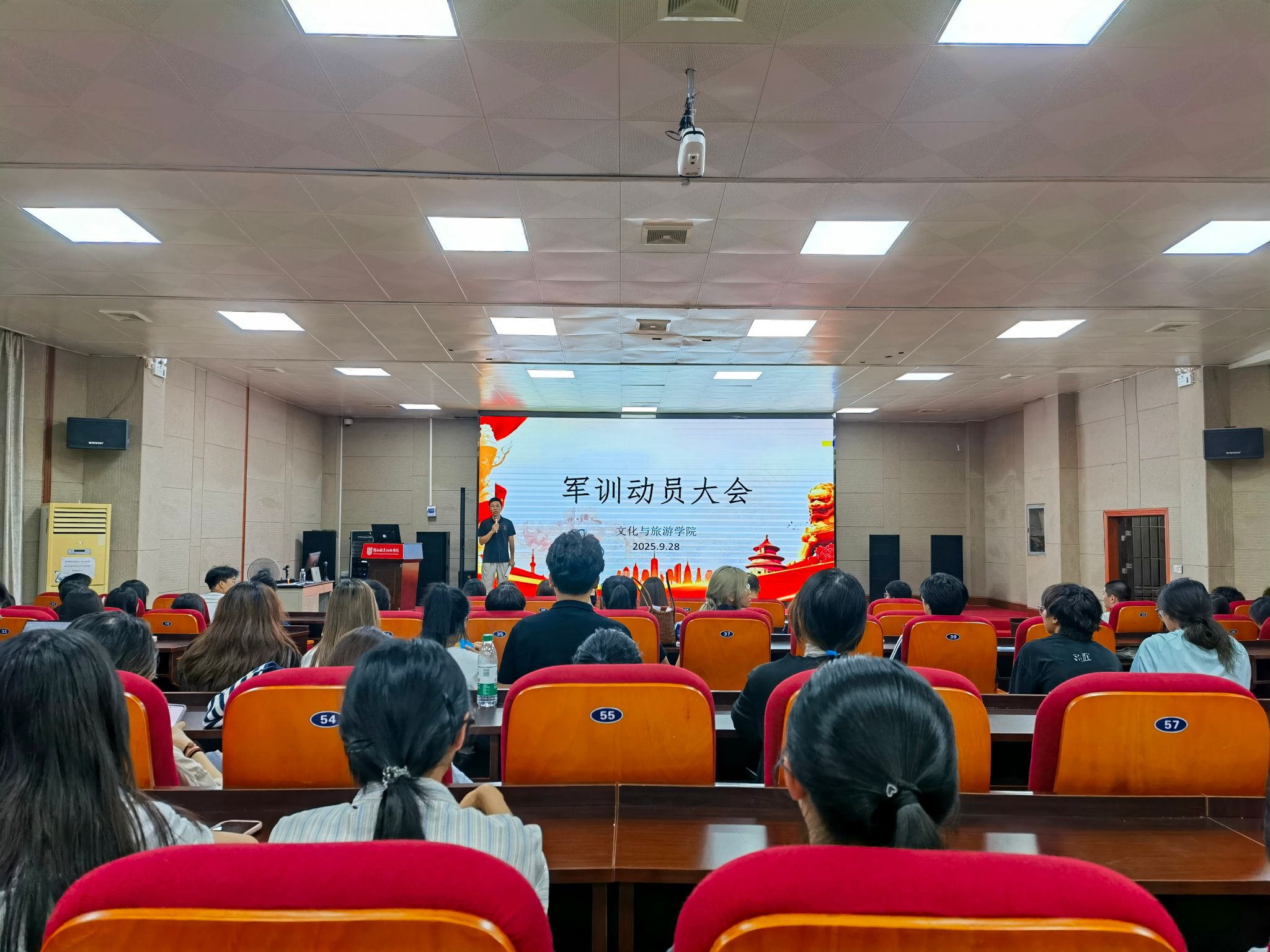 为强化新生国防意识,锤炼意志品质,扎实推进军训工作有序开展,9月28日晚,文化与旅游学院在3D实训室隆重召开2025级新生军训动员大会。学院党委负责人、思政负责人、院两委学生干部、2025级新生班委和宿舍长共计120名学生参会,共同开启军训征程。
