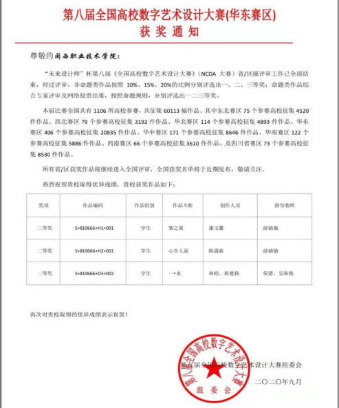 近日获悉,“未来设计师”杯第八届《全国高校数字艺术设计大赛》(NCDA大赛)评审工作已经全部结束。本届比赛全国共有1106所高校参赛,共征集60113副作品,其中华东赛区406所参赛高校征集20835件作品,我院3件作品喜获二等奖。