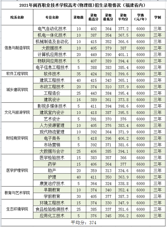 闽西职业技术学院2021年高考福建省内招生计划常规志愿一次性录满,物理组录取最高分449(本科线423),最低分310(去年293),平均分374(去年355);历史组录取最高分468(本科线467),最低分413(去年392),平均分434(去年427),录取分数再创新高。